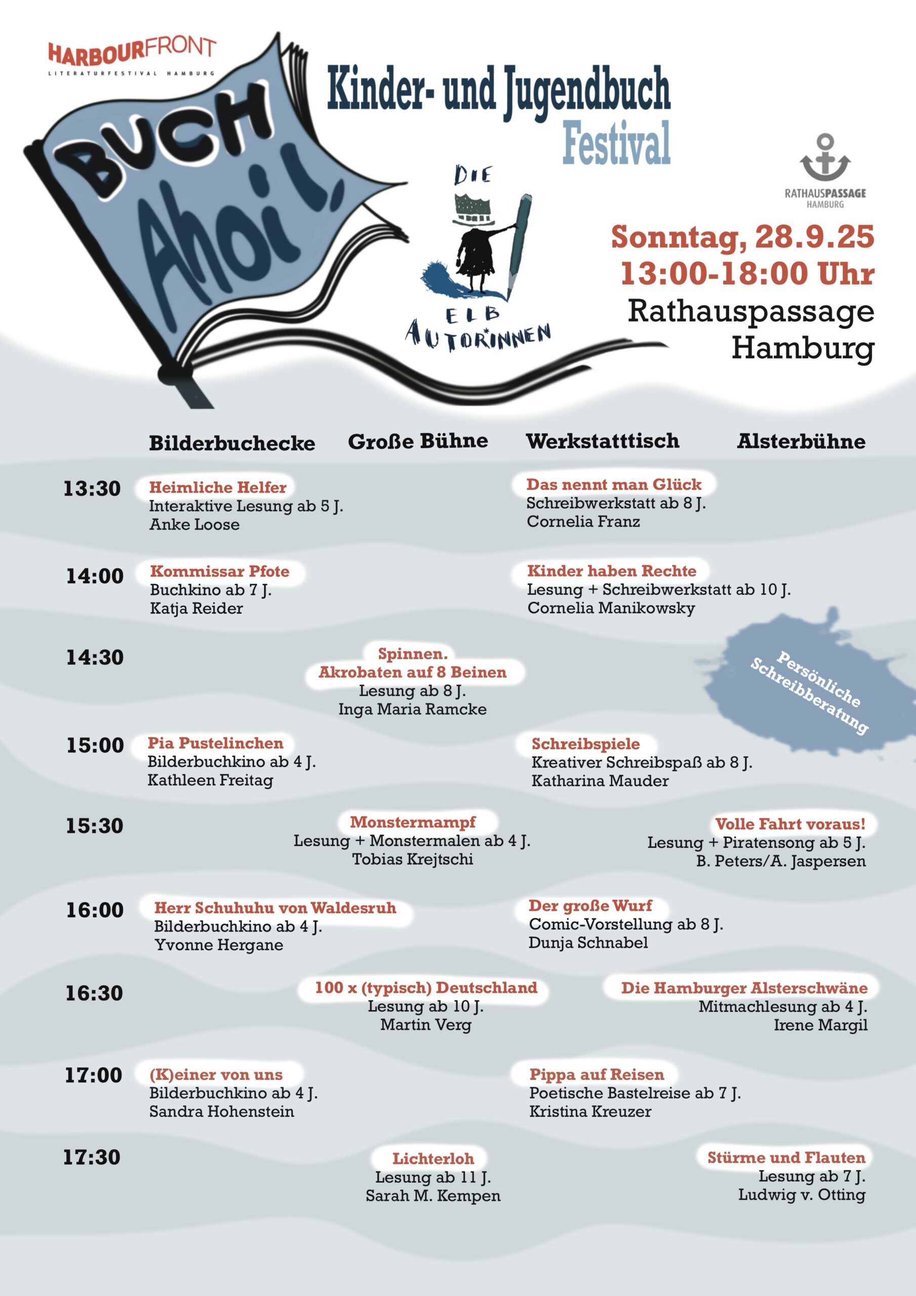 Damit bietet BUCH Ahoi! ein unvergleichbar kompaktes und vielfältiges Angebot für Kinder und Jugendliche zwischen 4 und 14 Jahren und alle Schreibbegeisterten, bei dem die Elbautor*innen erstmals die Möglichkeit für eine individuelle Schreibberatung geben!